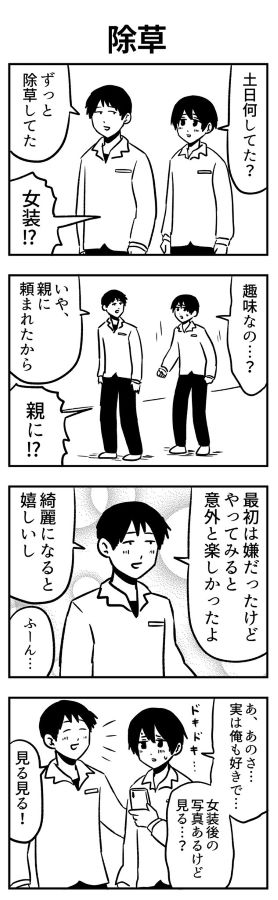 【漫画】「土日は除草してた」「女装!?」エスカレートする勘違い! 4コマギャグに「5コマ目見たい」の声【作者インタビュー】