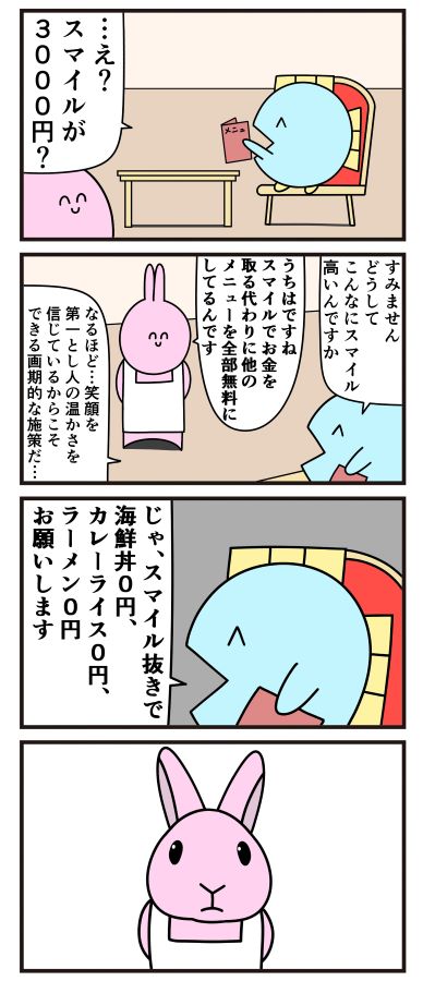 【漫画】スマイルが3千円、ほかのメニューが全部無料の飲食店 シュール4コマに「ゾッとした」