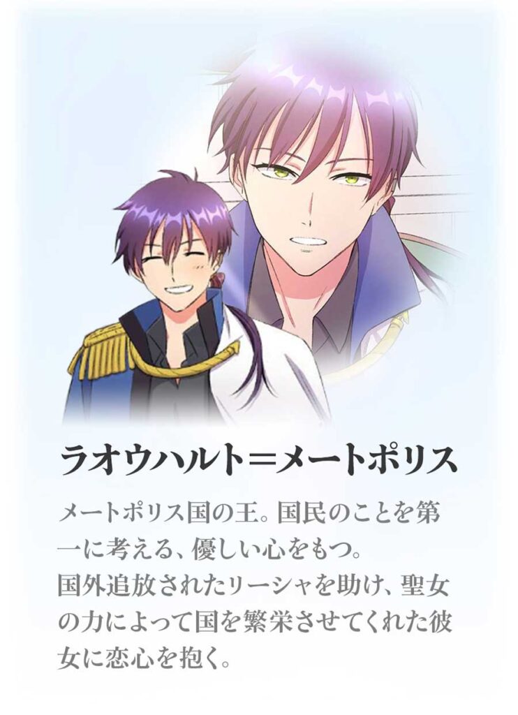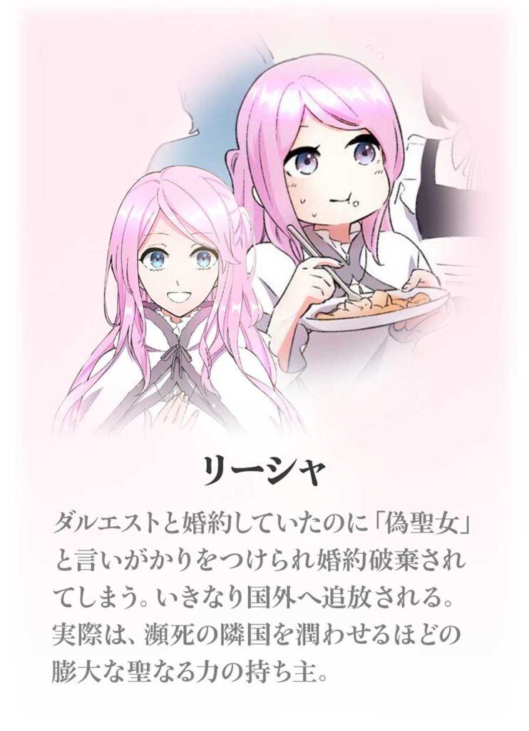“沼落ち”必至! アニコミ版『聖女なのに』が「Renta!」にて配信開始 声優に三森すずこら【PR】 2024.08.23 マグミクス編集部 キーワード : PR, Webマンガ, おすすめアニメ sponsored by 株式会社パピレス (Twitter) Facebook Hatena 【アニコミ】『聖女なのに国を追い出されたので、崩壊寸前の隣国へ来ました ~力を解放したので国が平和になってきましたが元の国まで加護は届きませんよ~』(C)ミドリ・RTC STUDIO・よどら文鳥/RentAnime 聖女なのに国を追い出されたので、崩壊寸前の隣国へ来ました ~力を解放したので国が平和になってきましたが元の国まで加護は届きませんよ~/作画:ミドリ RTC STUDIO │ 原作:よどら文鳥 │ 発行:Rentaコミックス リーシャ/ダルエスト婚約していたのに「偽聖女」と言いがかりをつけられ婚約破棄されてしまう。いきなり国外へ追放される。実際は、瀕死の隣国を潤わせるほどの膨大な聖なる力の持ち主 ラオウハルト=メートポリス/メートポリス国の王。国民のことを第一に考える、優しい心をもつ。国外追放されたリーシャを助け、聖女の力によって国を繁栄させてくれた彼女に恋心を抱く ダルエスト=バーズーデン/バーズーデン国の王。愛人のアエルを妻に迎えるため、婚約者のリーシャを国外追放。国を司る能力はないが自分を守るための悪知恵が誰よりも働く。性欲が人一倍強い リーシャ:三森すずこ ラオウハルト:榎木淳弥 ダルエスト:松岡禎丞 記事ページに戻る 画像ギャラリー