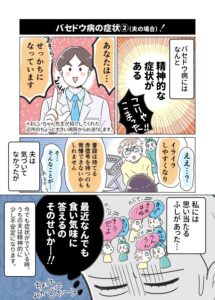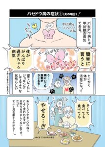 それまでもバセドウ病についてちらほら耳にすることはあったのですが、夫が罹患したときに私自身がバセドウ病について知識がなくて大変戸惑いました。同じような人が多い気がして、どのような病気か広く知ってもらえたらなと思って描きました。
