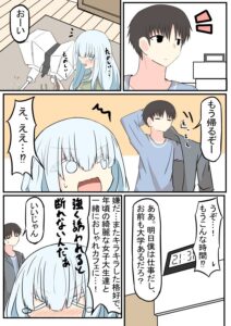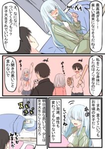 女子大生の女の子は、女友達のノリについていけず疲れ切っていました。「中身おっさん」な彼女は、幼なじみの男の子の家でのんびり過ごすことが唯一の楽しみです。しかしある日女友達から合コンの誘いを受け……。たけみつさんによるマンガがX(旧:Twitter)で公開され、「尊い」と反響を集めています。