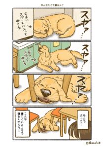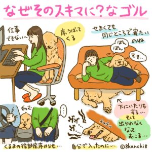 ゴールデンレトリーバーの「ケンちゃん」は、漫画家の8kanchi8さん(@8kanchi8illust)の実家で飼っているワンコです。ケンちゃんは、あらゆる生活の場面で「なぜ?」と思うかわいい行動をとるようです。少しでもスキマがあると……?