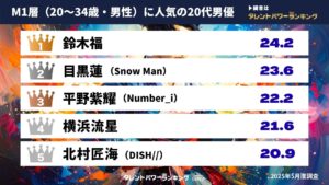 タレントパワーランキングは、M1層(20~34歳)の支持が厚い、20代男性俳優のランキングを発表しました。