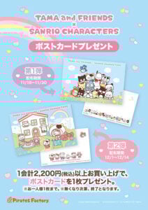 今回の催しでは「タマ&フレンズ」の公式グッズのほか、サンリオキャラクターズとのコラボレーショングッズ(第1弾、第2弾)をラインナップするといいます。さらに税込2200円以上の購入者には、特典として、サンリオキャラクターズとのコラボキーアートのポストカードがプレゼントされるそうです。