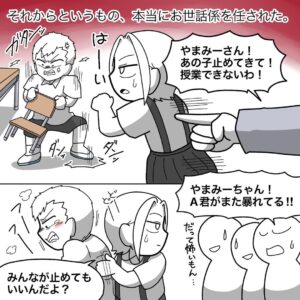 みんな知っていました! この男の子だけでなく、その後もいろいろな子の「お世話係」になっていました。私には知的障害のある弟がいることもあり、幼稚園の頃から支援級などで発達障害がある子と関わることが多かったんです。その経験もあってか、自分でも「ちょっと変わった子のお世話=慣れている自分がするべき」と感じていました。当時はいつの間にかお世話係になっていると思っていましたが、いま思えば自分からお世話係になっていたんだなと思いますね。