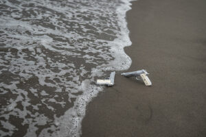 銃器の使い分け: アニメのエンディングで海に浸かる印象的なシーンを再現するため、今回の海ロケでは合計4丁のソードカトラスを用意しました。水濡れ専用のウォーターガン仕様と、ホルスターに差すためのKSC製モデルガンなどをシーンによって使い分けています。