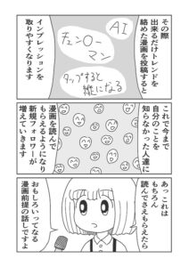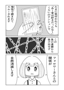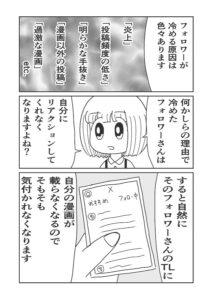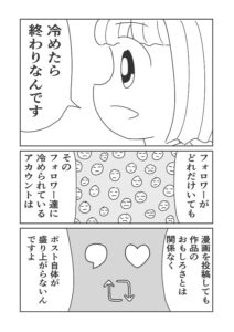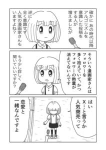 SNSマンガってマンガの面白さと同じくらい投稿頻度や変なポストしないとか、そういう意識が大事だと思うのですが、それって恋愛で言う身だしなみや行動、発言には気を付ける意識と一緒だと思うので、以前から人気商売も恋愛も同じだと考えていました。