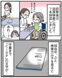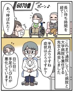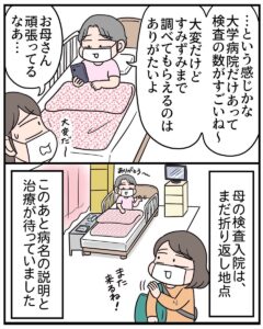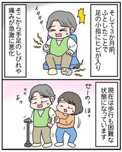 手足がしびれ、歩けないほどに悪化しても病名が分からない母。漫画家である娘に「病気のことをマンガに描いて」といってきました。そして、大学病院で精密検査をしたところ……。読者からは、「病院に行くきっかけになりました」「描いてくれてありがとう」などの声があがっています。