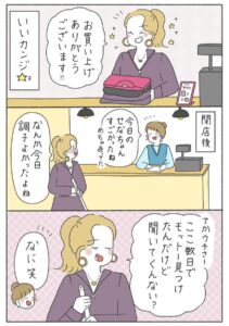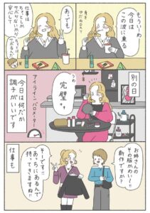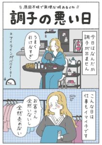 今日は何だか調子が出ないギャルの女性。アイラインがうまく引けるかどうかがバロメーターです。こんな日はショップ店員の仕事もイマイチで、お客さんも少なく商品も売れません。毎日をゆるく明るく生きる彼女は、こんな日をどのように乗り切るのでしょうか……?