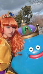撮影場所は、淡路島にあるアニメ・ゲーム・映画など二次元コンテンツの世界観を体験できるアニメパーク「ニジゲンノモリ」。ドラクエエリアでキングスライムと並んだり、ツボを探索したりするシーンを切り取った写真は、まるでゲームの一場面が現実に飛び出したかのようです。プリンセスへの深い愛情と、ミリ単位で計算されたドレス制作のこだわりを、本人に語ってもらいました。