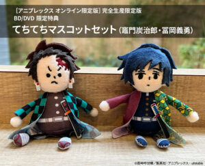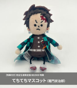 商品のラインナップは、『[特典付き]完全生産限定版 Blu-ray/DVD』の特典に「てちてちマスコット(竈門炭治郎)」が用意されています。また、『[アニプレックス オンライン限定版]完全生産限定版 Blu-ray/DVD』を選択すると、「てちてちマスコットセット(竈門炭治郎・冨岡義勇)」が付属する仕組みとなっています。なお、通常版にはこれらの特典は付属しないため、購入時には注意が必要です。