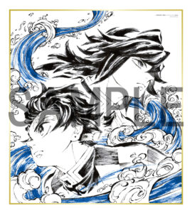 特典内容は、本映画のキャラクターデザインおよび総作画監督を務めた松島晃さんが描き下ろした色紙です。色紙には「竈門炭治郎」と「冨岡義勇」の姿が描かれており、ふたりの間を縫うように配置された水のエフェクトが印象的な仕上がりとなっています。静かな決意の瞬間を思わせるシリアスで美しい雰囲気が漂っており、まさにファン垂涎の逸品でしょう。