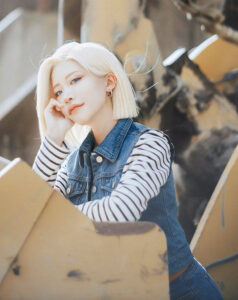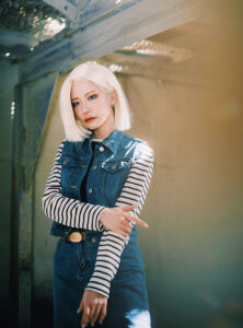 18号は、私の中ではあまり「かわいい」という印象のキャラクターではなくて、この撮影では特に未来トランクスがいた世界線の、より冷徹な印象の強い18号を意識していました。なので、かわいさはできるだけ抑えて、冷たく鋭い雰囲気が出るように、テーピングで目つきをきつめに見せつつ、それでも女性らしさはなくならないように、メイクのバランスを工夫しました。