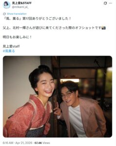 久しぶりに回想で信右衛門が登場した17話の放送後、「見上愛&STAFF」のXアカウントは、「父上、北村一輝さんが遊びに来てくださった際のオフショットです」と、りんの衣装姿の見上さんと、現場にやってきた洋服にメガネ姿の北村さんの写真をアップしました。久々の「親子」の2ショットに、ファンからは