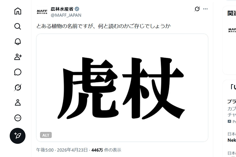農林水産省の公式X(旧Twitter)アカウント(@MAFF_JAPAN)が2026年4月23日、「とある植物の名前ですが、何と読むのかご存じでしょうか」というコメントとともに、「虎杖」の漢字2文字の画像を投稿しました。