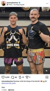 『ばけばけ』終了後、坊主になってがらっと雰囲気が変わった姿や、ボーカルを務めるバンド・Frankoのメンバーとの写真を見せていたトミーさんは、「Seminar with the King of the North! Osu!」と、「キング・オブ・ザ・ノース」の異名を持つスコットランド出身のフェザー級ムエタイ世界王者、ニコ・カリロさんとの2ショットをアップしました。Tシャツと短パン姿で、カリロさんからムエタイを教わったようです。
