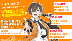 今回のMV『アオペラの「ア」-introduction song-』は、公開当初より楽曲の再生回数に応じて今後の企画を決定する応援キャンペーンが実施されており、既にLINEスタンプ第2弾の制作や、ノベライズ書籍の制作が決定しています。