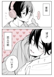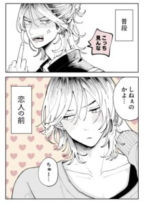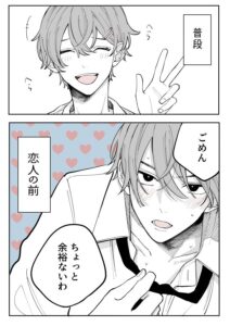 タイプの異なる4人の男子が登場する、4ページのマンガがTwitterで話題を集めています。卯月ココさん(@uzcoco_66)によるマンガ『恋人の前だけギャップ』は、それぞれの男子の普段の姿と、恋人の前での姿が2コマ構成で描かれており、そのギャップに萌えること必至です。
